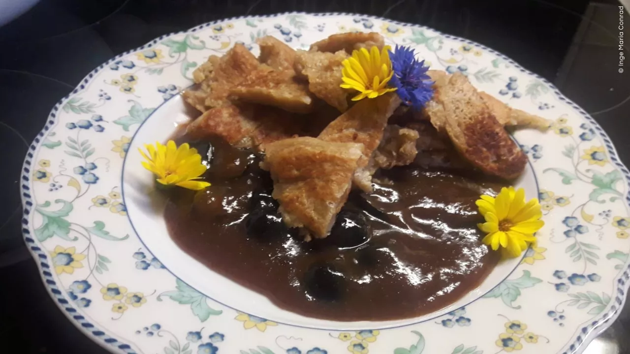Den Böhmischen Sterz auf dem Kriecherl-Röster servieren, essbare Blüten als Deko und Geschmackshighlight zugeben oder ein Zitronenmelissenblatt – passt geschmacklich sehr gut.
