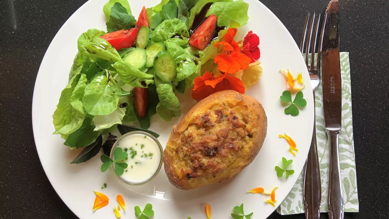 Diese Masse in den ausgehöhlten Erdäpfel füllen und bei 200° ca. 20 Minuten überbacken.